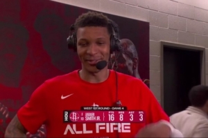 体育资讯4月27日讯 在今天结束的一场季后赛中,火箭以115-96战胜湖人,大比分1-3落后。赛后,火箭球员小贾巴里·史密斯接受了媒体的采访。以下是完整版采访内容。