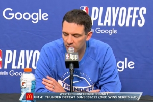体育资讯4月28日讯 NBA季后赛首轮G4,雷霆131-122胜太阳,大比分4-0晋级。赛后雷霆主帅戴格诺特接受了媒体采访,以下为完整版采访内容。