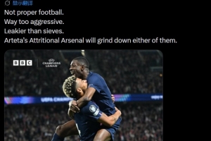 摩根写道:“这根本不是真正的足球。踢得太激进,防线漏得像筛子一样。阿尔特塔那支追求消耗的阿森纳,足以磨死他们中的任何一个。”